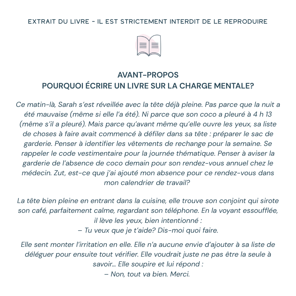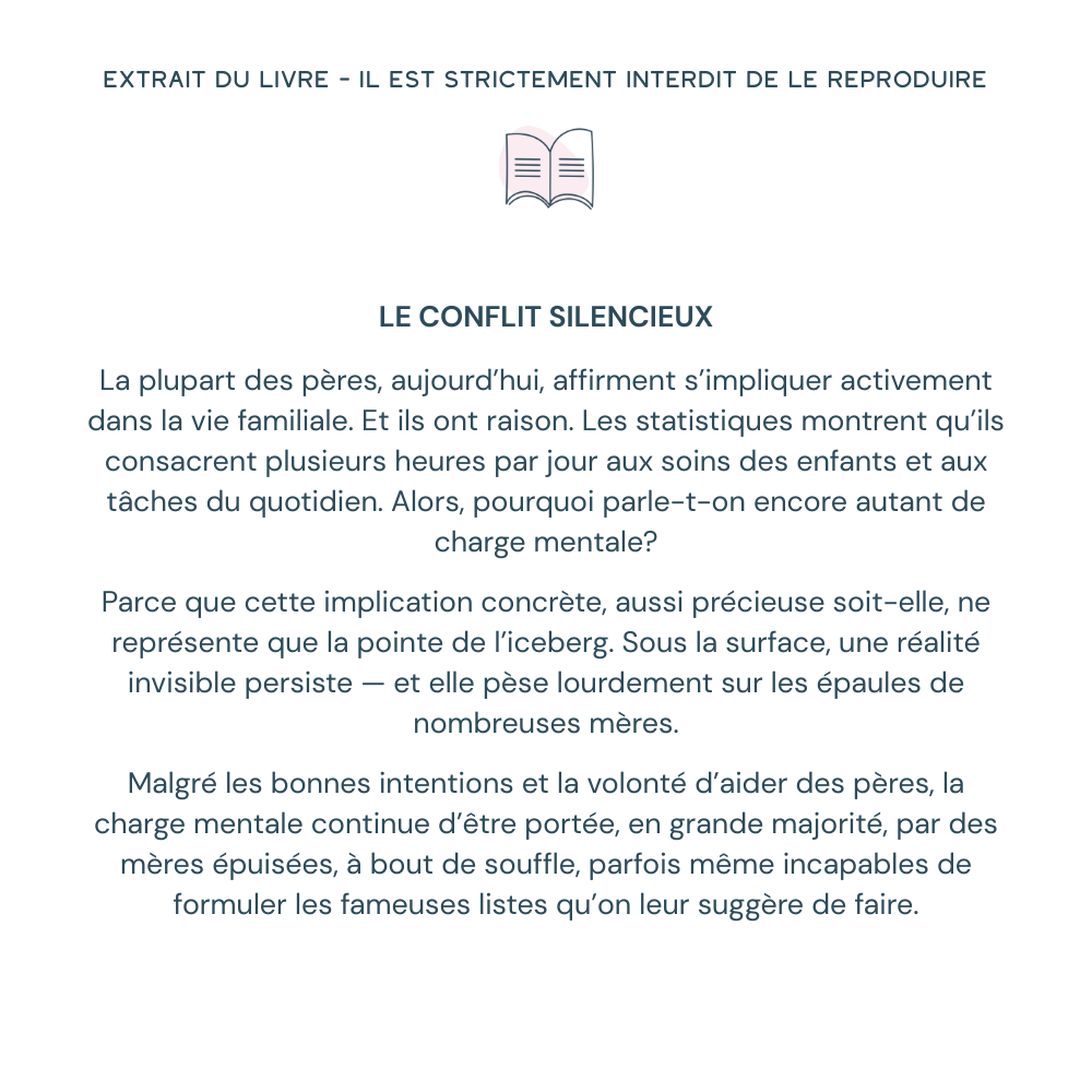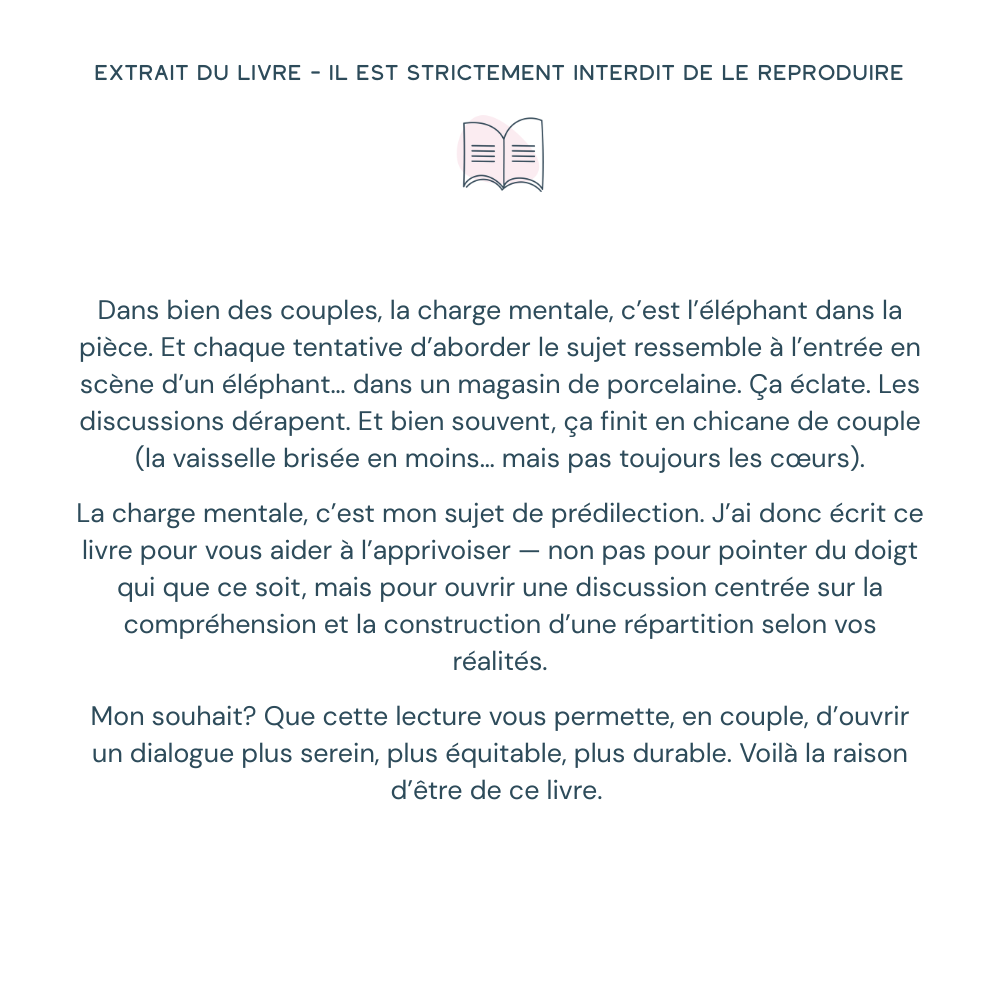« Dans bien des couples, la charge mentale, c’est l’éléphant dans la pièce. Et chaque tentative d’aborder le sujet ressemble à l’entrée en scène d’un éléphant… dans un magasin de porcelaine. Ça éclate. Les discussions dérapent. Et bien souvent, ça finit en chicane. »